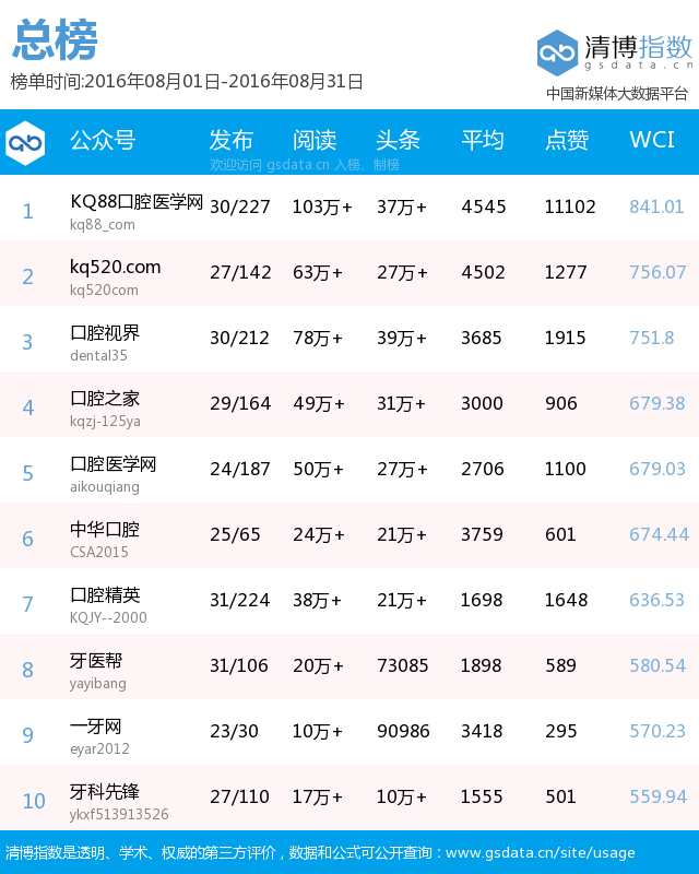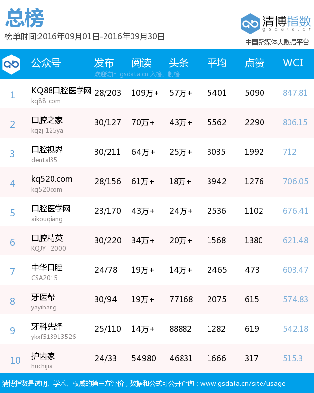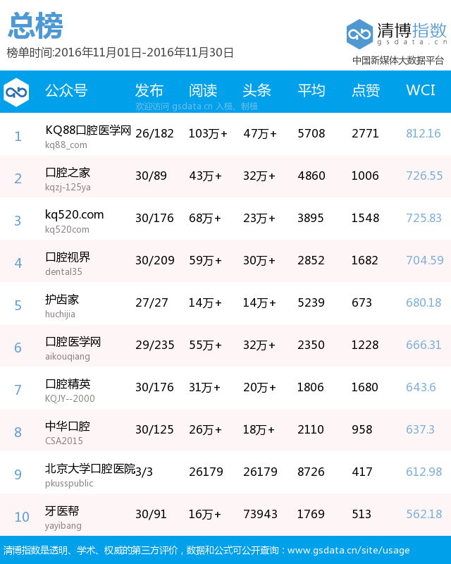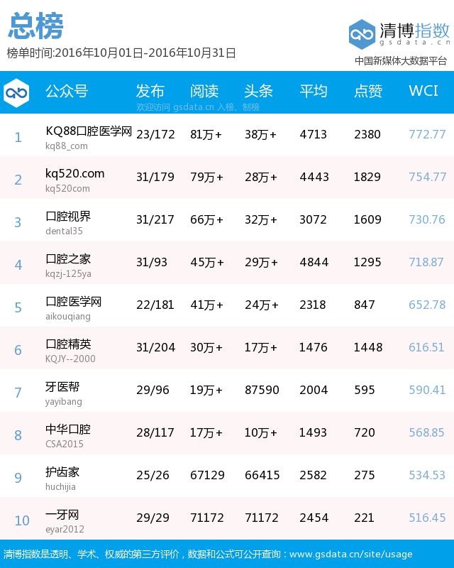 1、平臺領(lǐng)先:是目前口腔醫(yī)療行業(yè)領(lǐng)先的公眾賬號,在粉絲數(shù)量、IP及PV流量等,均居于同行前列。